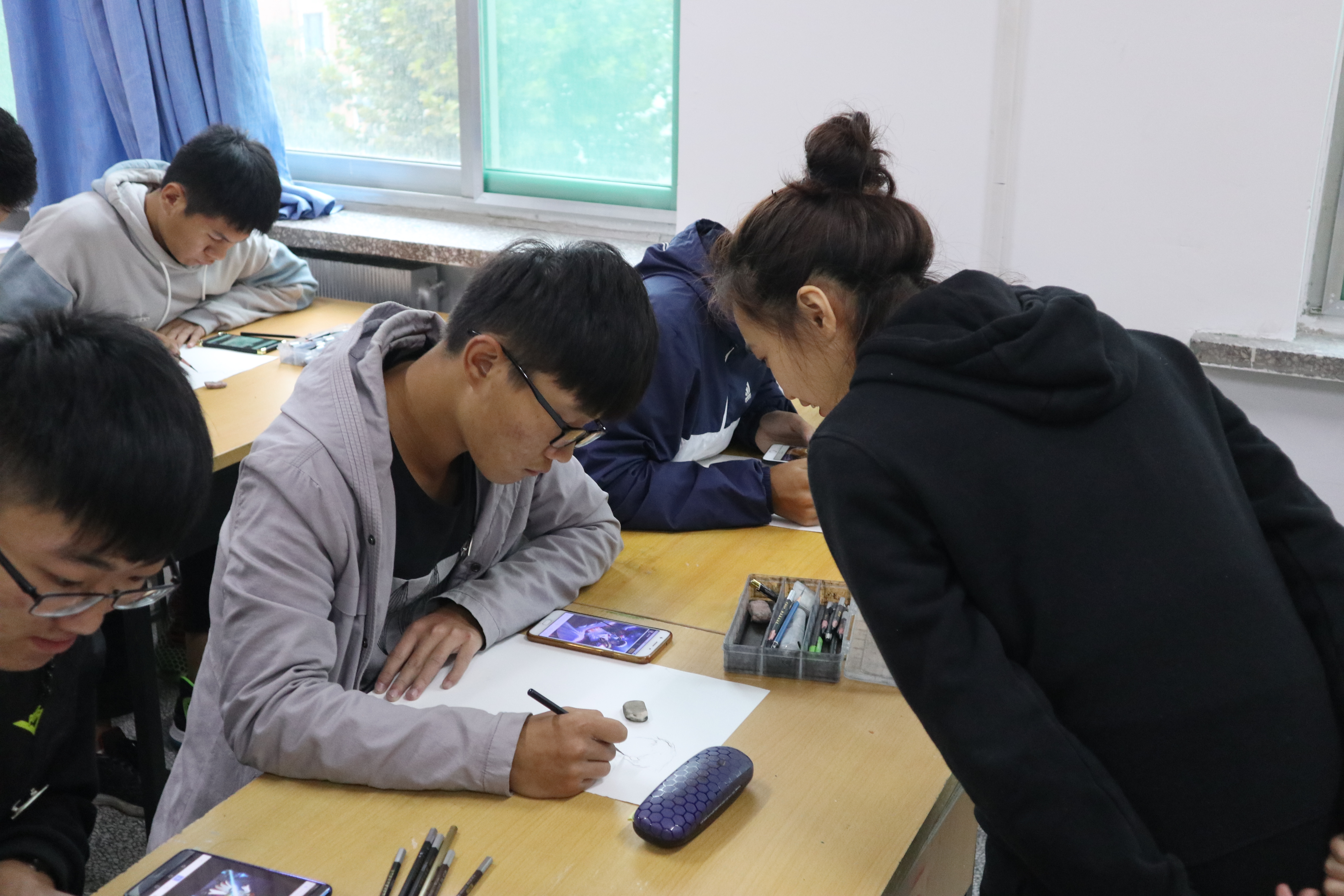 寂静的教室里铅笔的影子在洁白的素描纸上疯狂的摇曳着,发出“沙沙沙”的声响。同学们专注的神情仿佛将我们带进了当年的艺考现场,在这一刻他们似乎坚定了笔下的梦想。