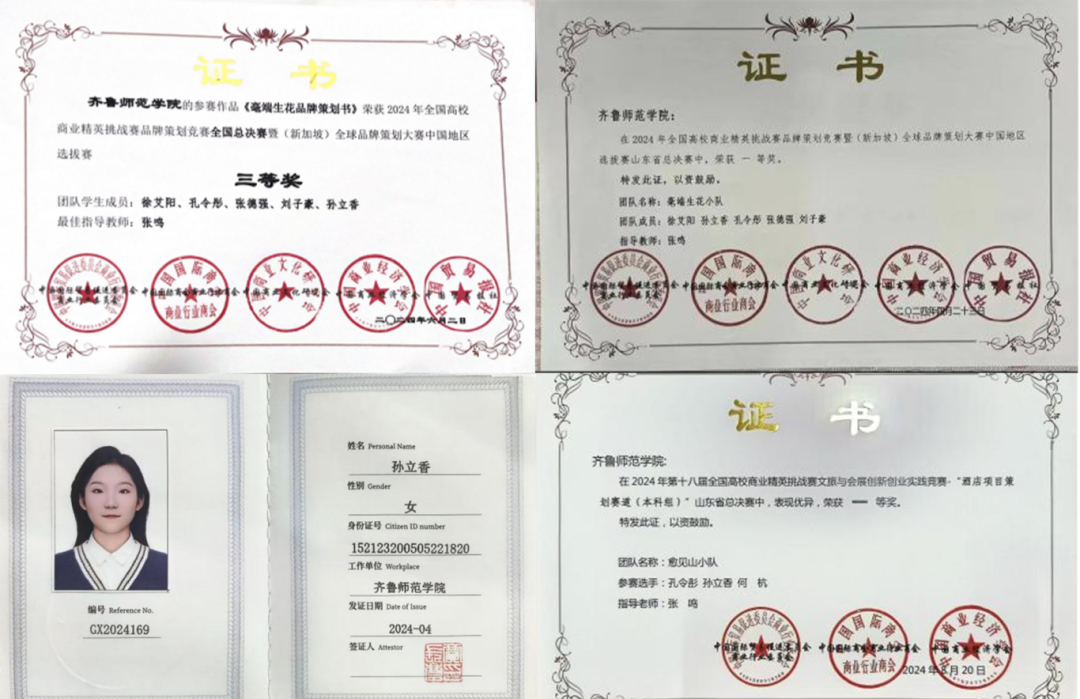 在校期间获得,2024年6月获2024年全国高校商业精英挑战赛“中图科信杯”品牌策划竞赛全国总决赛暨(新加坡)全球品牌策划大赛中国地区选拔赛三等奖;2024年5月获全国高校商业精英排战赛2024年全国高校商业精英挑战赛“中图科信杯”品牌策划竞赛暨(新加坡)全球品牌策划大赛山东省总决赛一等奖;