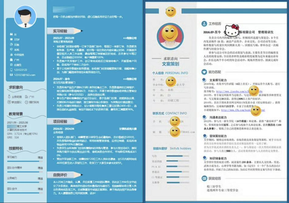 不能太另类、太花里胡哨。好的简历模板应该干净整洁、排版清晰、一眼就能看到重点、字体统一、字距行距恰当、没有错别字。一些模板能很好地弥补个人经历不足的短板,适合内容相对较少的学生;一些模板可以将较多的内容合理排布,体现充实的实习实践经历。大家可以根据自己的实际情况进行选择,合理展现自己的特点和经历。比如下图: